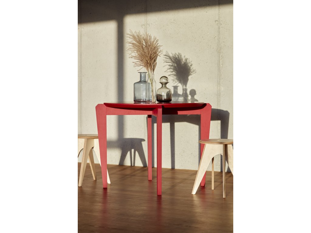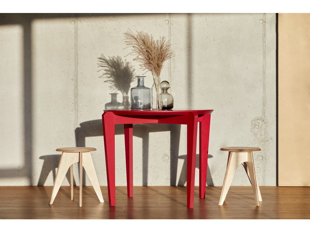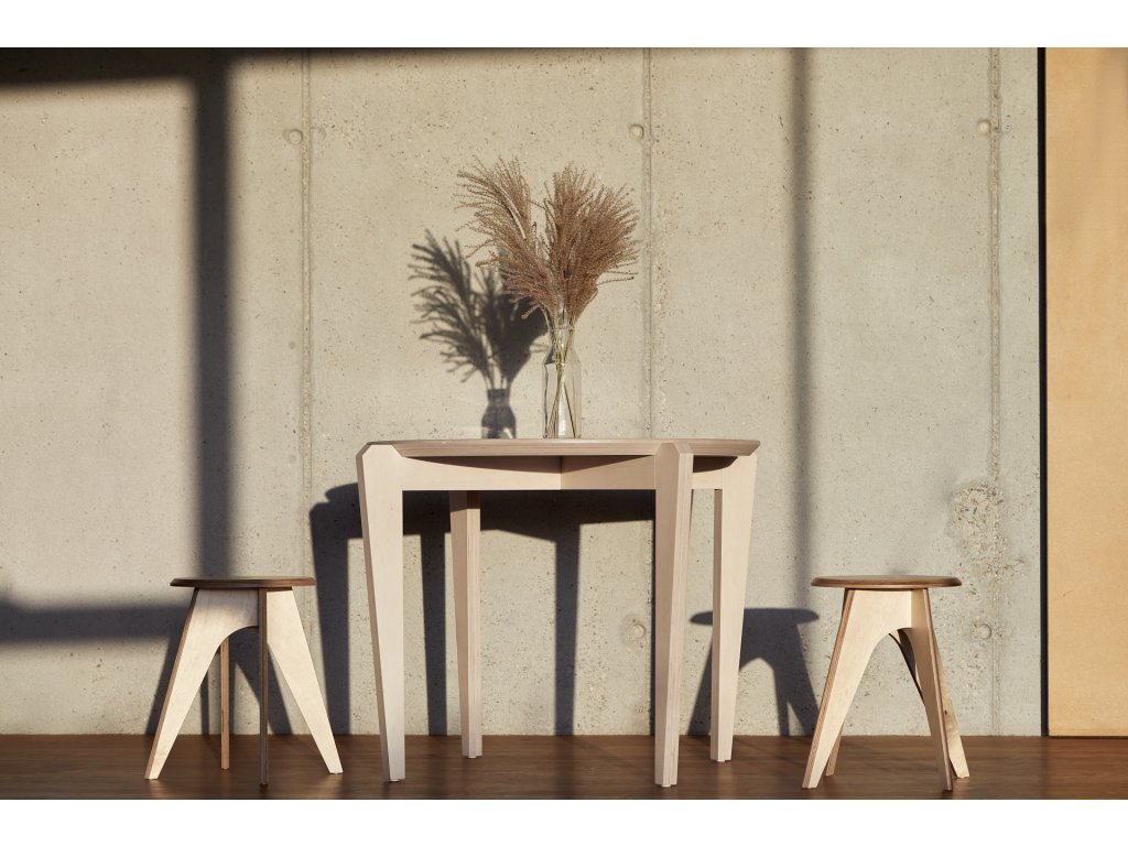 Ke kulatému stolu Krab mohou pohodlně zasednout čtyři osoby nejen k dobrému jídlu, ale i k rovnoprávné diskuzi. Jeho konstrukce je řešena kompletně z překližky a přidanou hodnotu mu dodavá možnost barevného výtvarného zpracování.